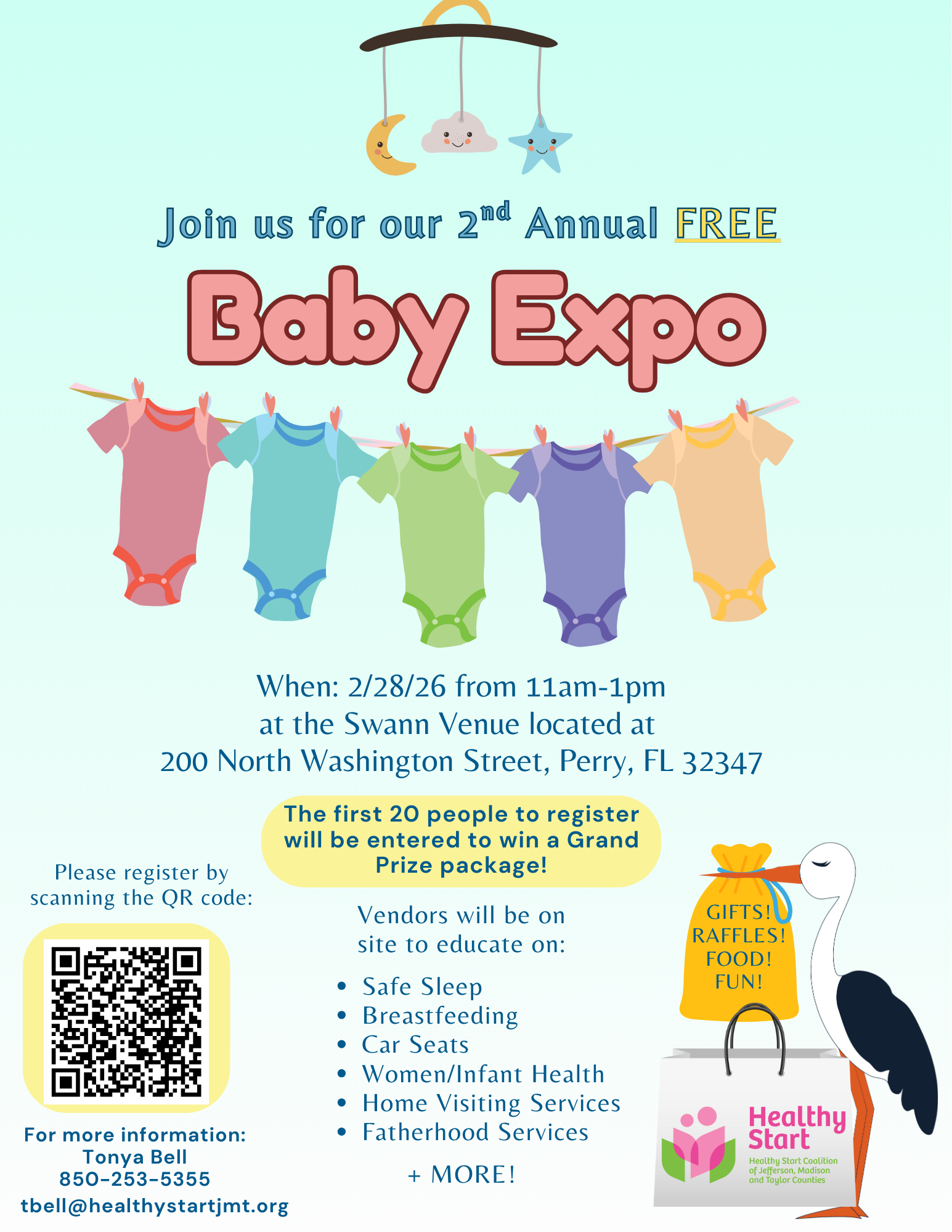 850-253-5355Join us for our Baby Expo, a one-stop event for expectant parents and families with young children. Enjoy free resources, educational materials, community vendors, and helpful information on prenatal care, infant safety, breastfeeding, and more.